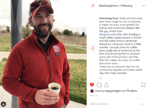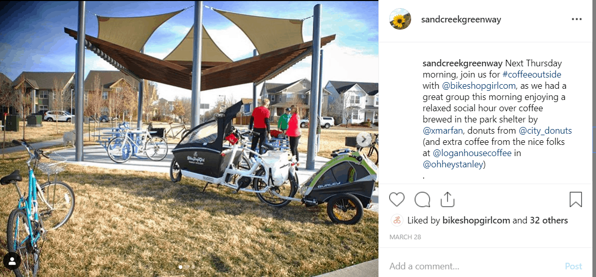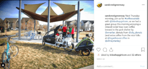 “Our trail organization co-hosts a #coffeeoutside gathering in a park each Thursday morning with a local bike shop. It is an opportunity to walk, bike or drive to share a relaxed social hour together. It is a great way to meet neighbors and solve the world’s problems. It could just as easily be set up outside a coffee shop. The point is: get outside, drink coffee, meet neighbors. We always have one type of coffee already made up, but invite roasters, shops and individuals to roast a pot on a camping set-up.”