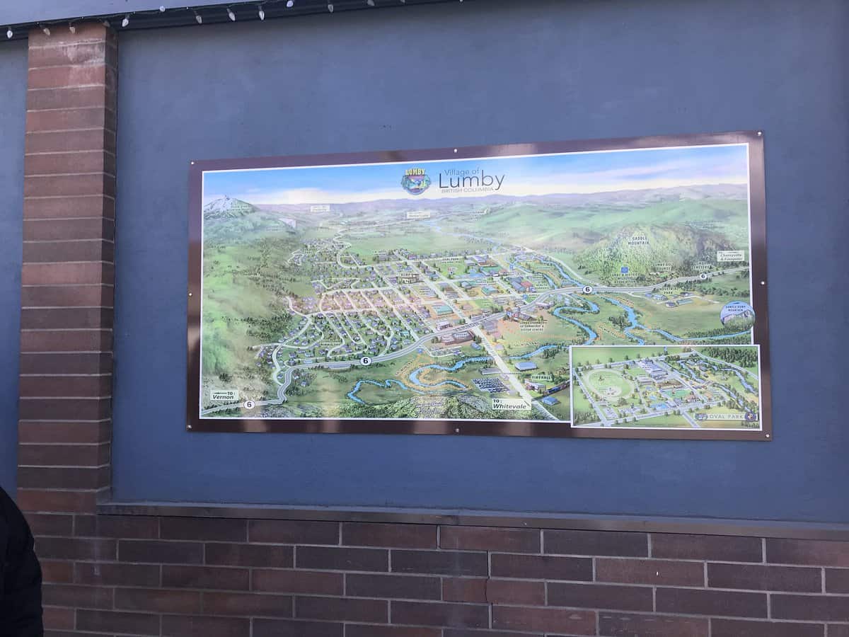 This wayfinding map of the town of Lumby, British Columbia, Canada, includes an inset map of the town park. The design is printed on metal and mounted on the building. When it fades, it will be easy to replace.