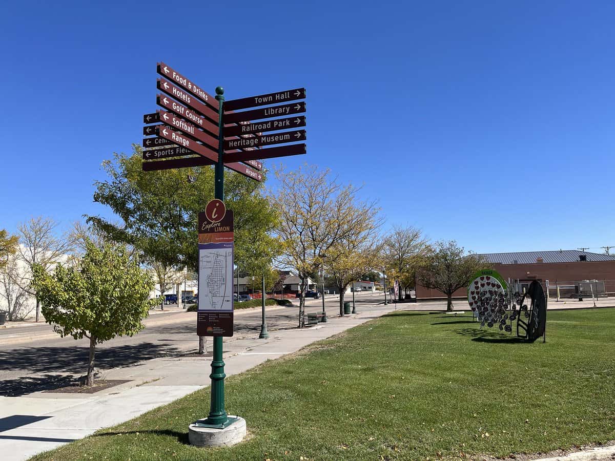 Limon, Colorado, has the full wayfinding sign package: directional arrows to all the amenities, plus a map of the town mounted on the post.