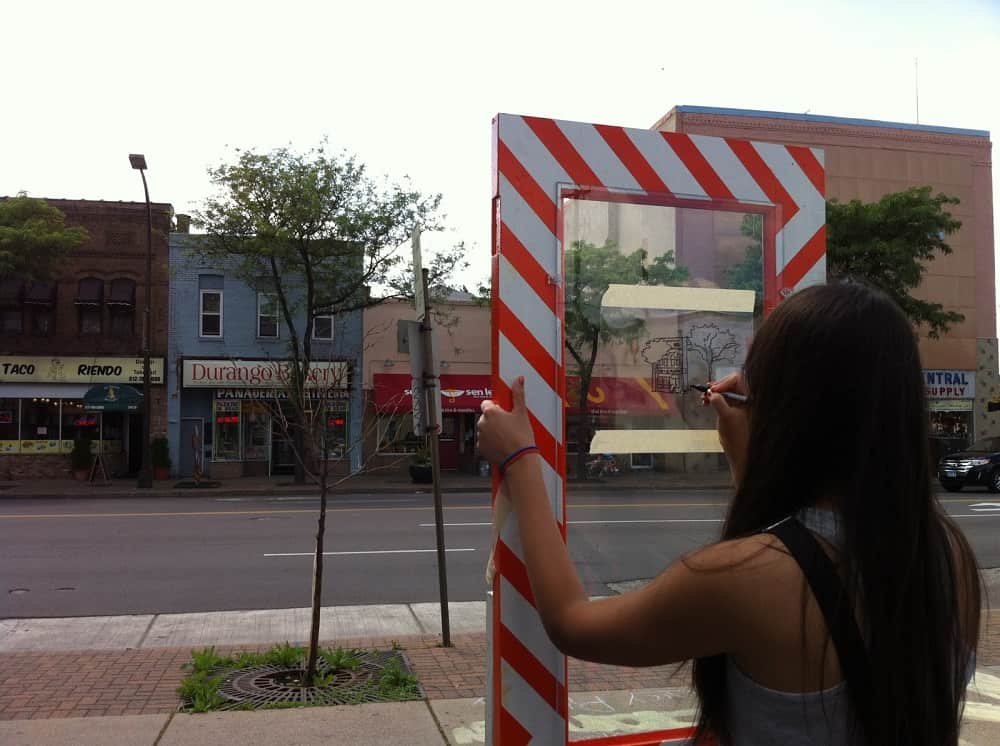 Second is from Witt Siasoco, called the Mobile Tracing Unit. It invites people to trace the outline of an actual building in their neighborhood of Minneapolis. (See the photo below.) Learn more about it at Drawing on Minneapolis.