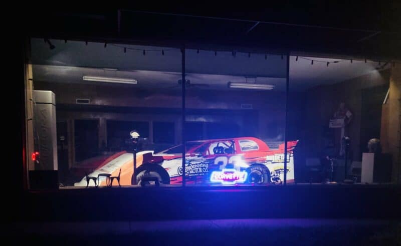 Deb Brown spotted this real world example in Mt. Ayr, Iowa. The dealership that used to be located here has moved to a different location closer to the highway. They still own this building downtown, but don’t use it for retail business. While they aren’t going to open the showroom for the holidays, they’ve put a race car in the display window.