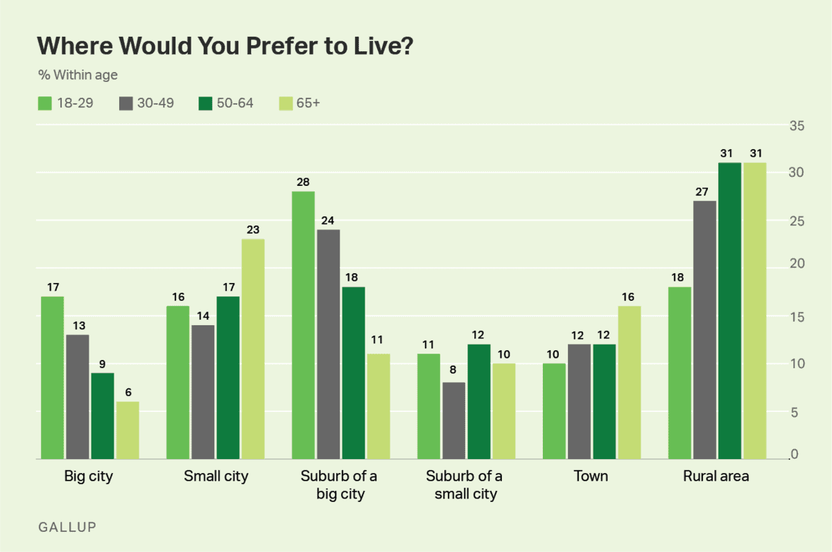 In 2018, Gallup asked people where they preferred to live. Rural came out on top for all age groups except for 18-29 year olds. With the 18-29 year olds, rural came in a surprising second.